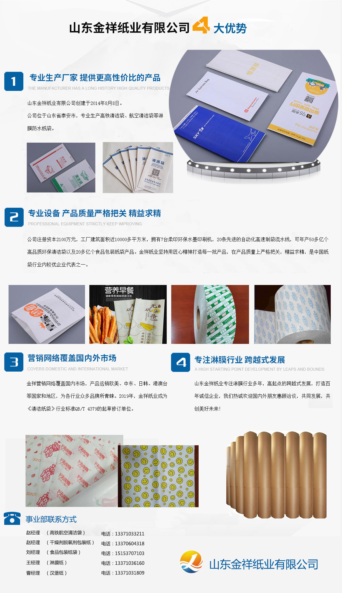 山東金祥紙業(yè)有限公司創(chuàng)建于2014年8月8日,公司位于山東泰安,專業(yè)生產高鐵清潔袋、航空清潔袋等淋膜防水紙袋。公司注冊資本2100萬元,工廠建筑面積近10000多平方米,擁有7臺柔印環(huán)保水墨印刷機,20條先進的自動化高速制袋流水線,可年產50多億個高品質環(huán)保清潔袋以及20多億個食品包裝紙袋產品。金祥紙業(yè)堅持用匠心精神打造每一批產品,在產品質量上嚴格把關,精益求精,是中國紙袋行業(yè)內較優(yōu)企業(yè)代表之一。金祥營銷網絡覆蓋國內市場,產品遠銷歐美、中東、日韓、港澳臺等國家和地區(qū),為各行業(yè)眾多品牌所青睞。2019年,金祥紙業(yè)成為《清潔紙袋》行業(yè)標準QB/T 4379的起草修訂單位。